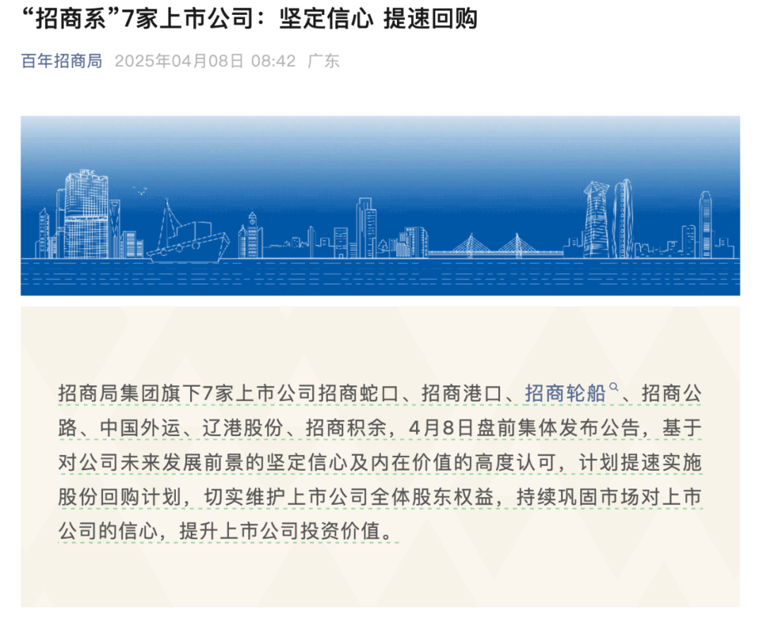招商局集团旗下7家上市公司招商蛇口、招商港口、招商轮船、招商公路、中国外运、辽港股份、招商积余,4月8日盘前集体发布公告,基于对公司未来发展前景的坚定信心及内在价值的高度认可,计划提速实施股份回购计划,切实维护上市公司全体股东权益,持续巩固市场对上市公司的信心,提升上市公司投资价值。